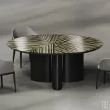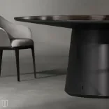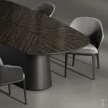 Рассмотрим, тандем стола Poise, в оттенке Onyx Black и стульев Pelago Rotate. Столешница из натурального шпона с выразительными узорами гармонично сочетается с дизайном стульев. В том числе за счет гладкого основания стола из натуральной кожи. Вертикальные складки на мягкой итальянской коже спинки стульев Pelago Rotate создают рельеф, который образует симбиоз с узором столешницы.