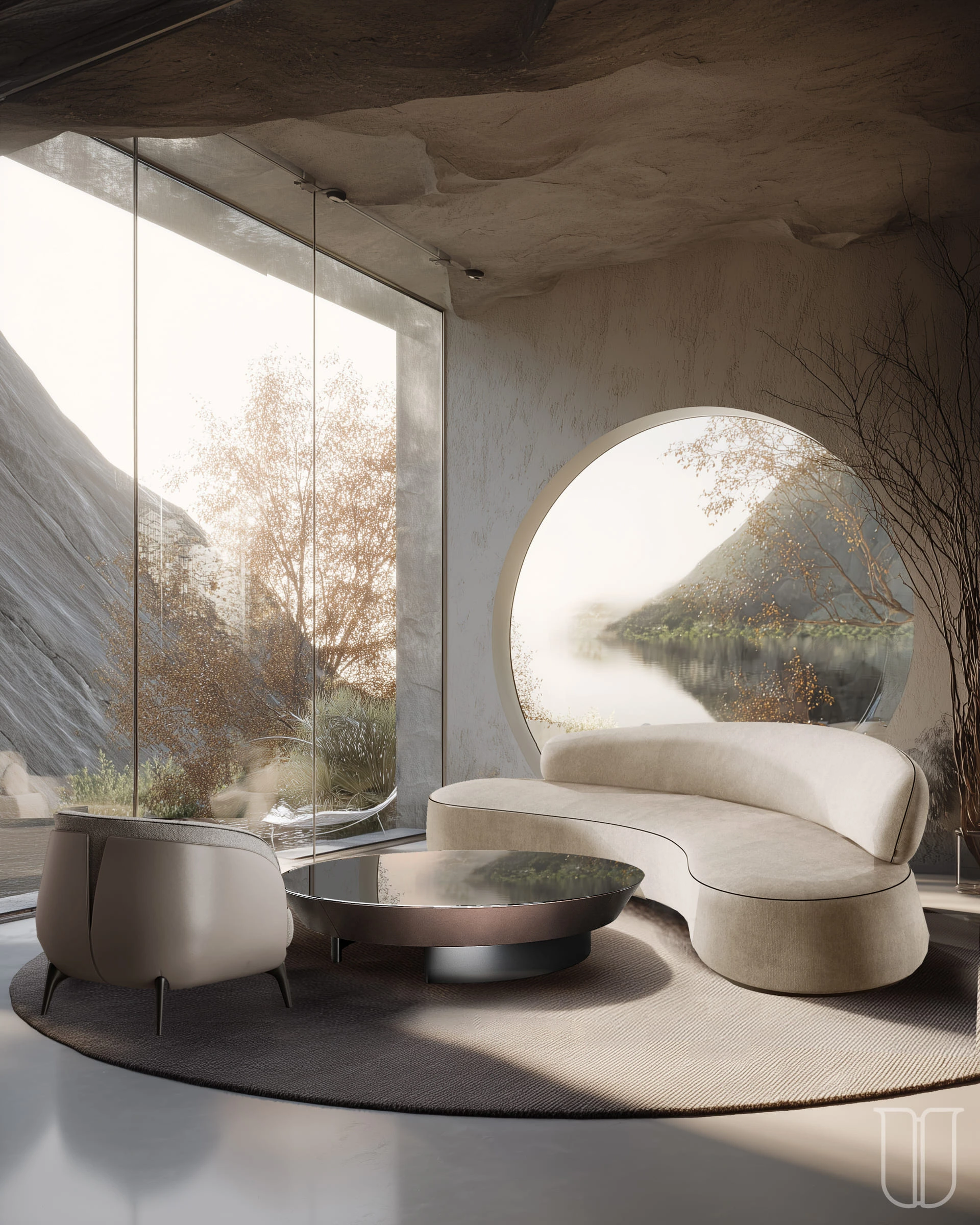 В интерьере роскошного глэмпинга на берегу озера диван Virgola становится продолжением природного пейзажа — спокойного, текучего, лишенного резких линий. Его обтекаемая форма мягко перекликается с линией воды, отражениями неба и плавным силуэтом прибрежного ландшафта.