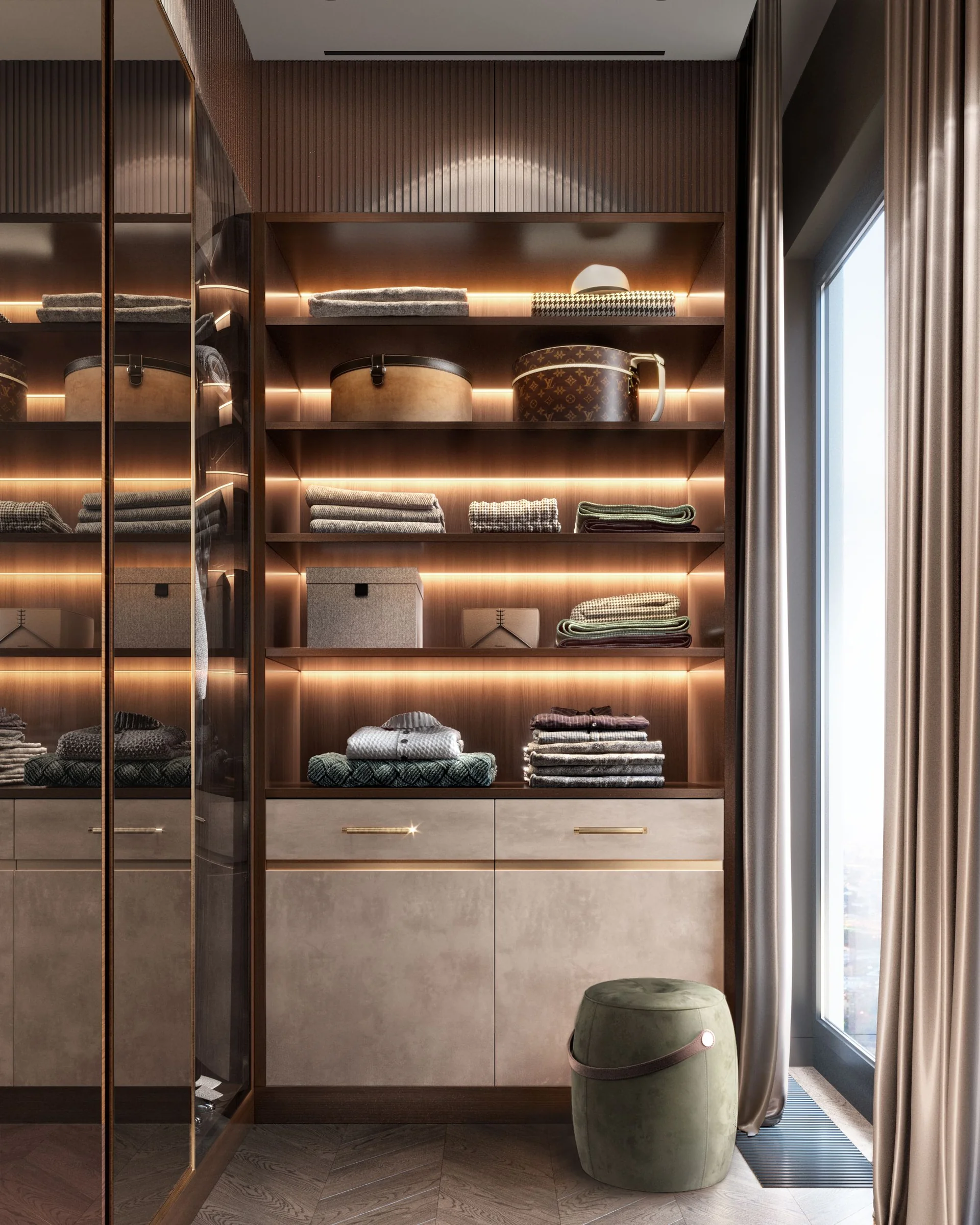 - Зона ухода за собой. Обратите внимание на лаконичные туалетные столики со встроенным зеркалом ― они придадут особую атмосферу ритуалам красоты и заботы о себе.