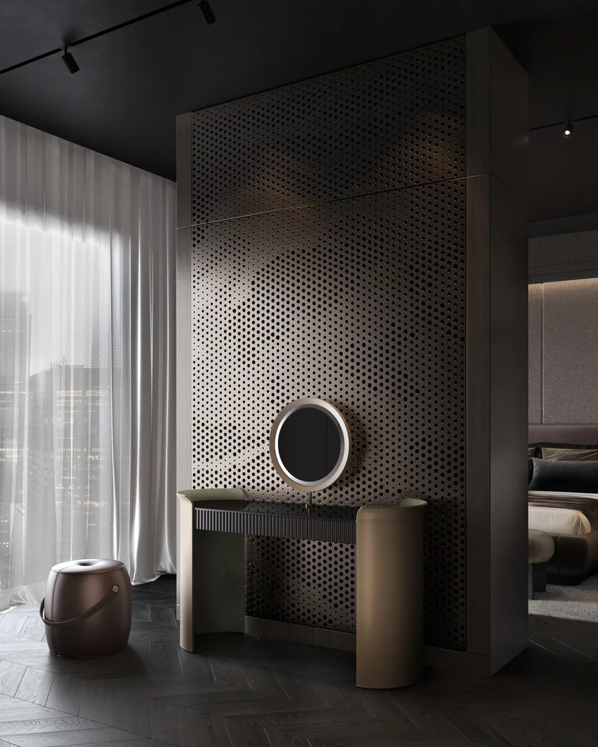 Дополнительную зону в спальне может сформировать туалетный столик. Он подходит как для утренних, так и вечерних ритуалов. Туалетные столики FiftyFourms создаются вручную на мануфактуре бренда в Санкт-Петербурге, где итальянские технологии сочетаются с авторским российским дизайном. Ключевая модель Artistry объединяет бархатистую замшу и натуральную кожу, а встроенное зеркало с подсветкой и розетки повышают комфорт ежедневного использования.