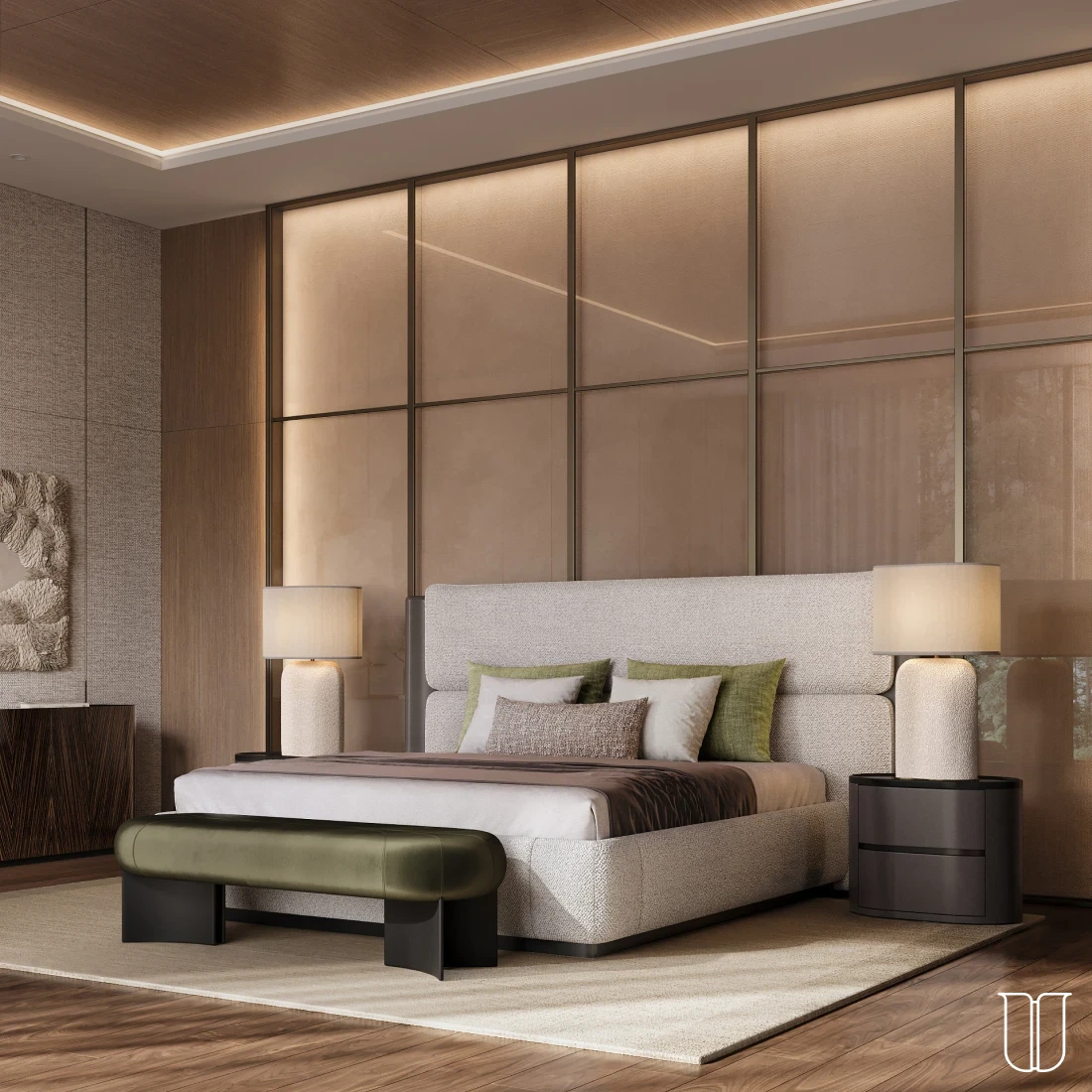 In a cozy bedroom interior, the Balance bench in Vintage Sandal velvet softly complements the Fideia bed in the airy, light Silver Drop tone and the Drum bedside tables. Here, color layering is brought into a single composition: the shades do not compete but instead reinforce a sense of harmony, depth, and visual balance.