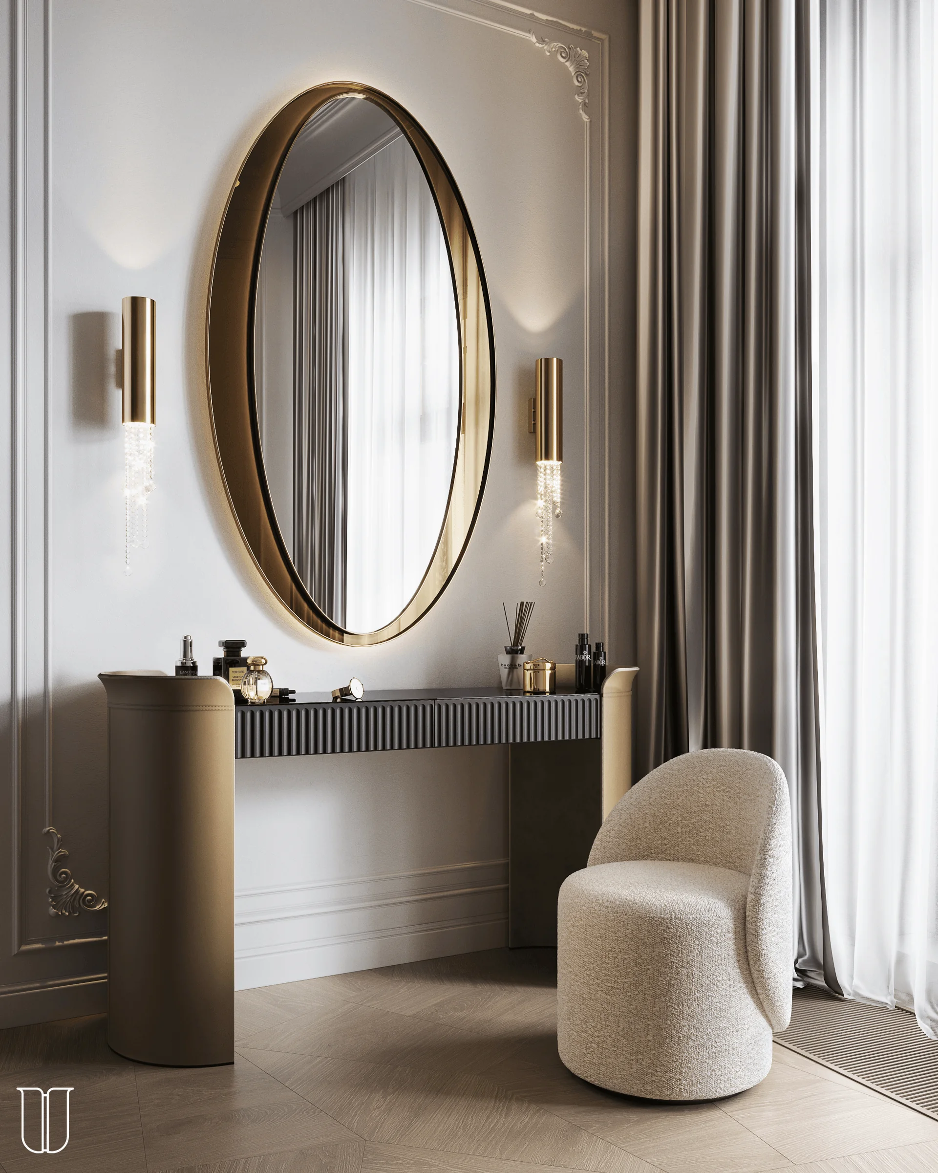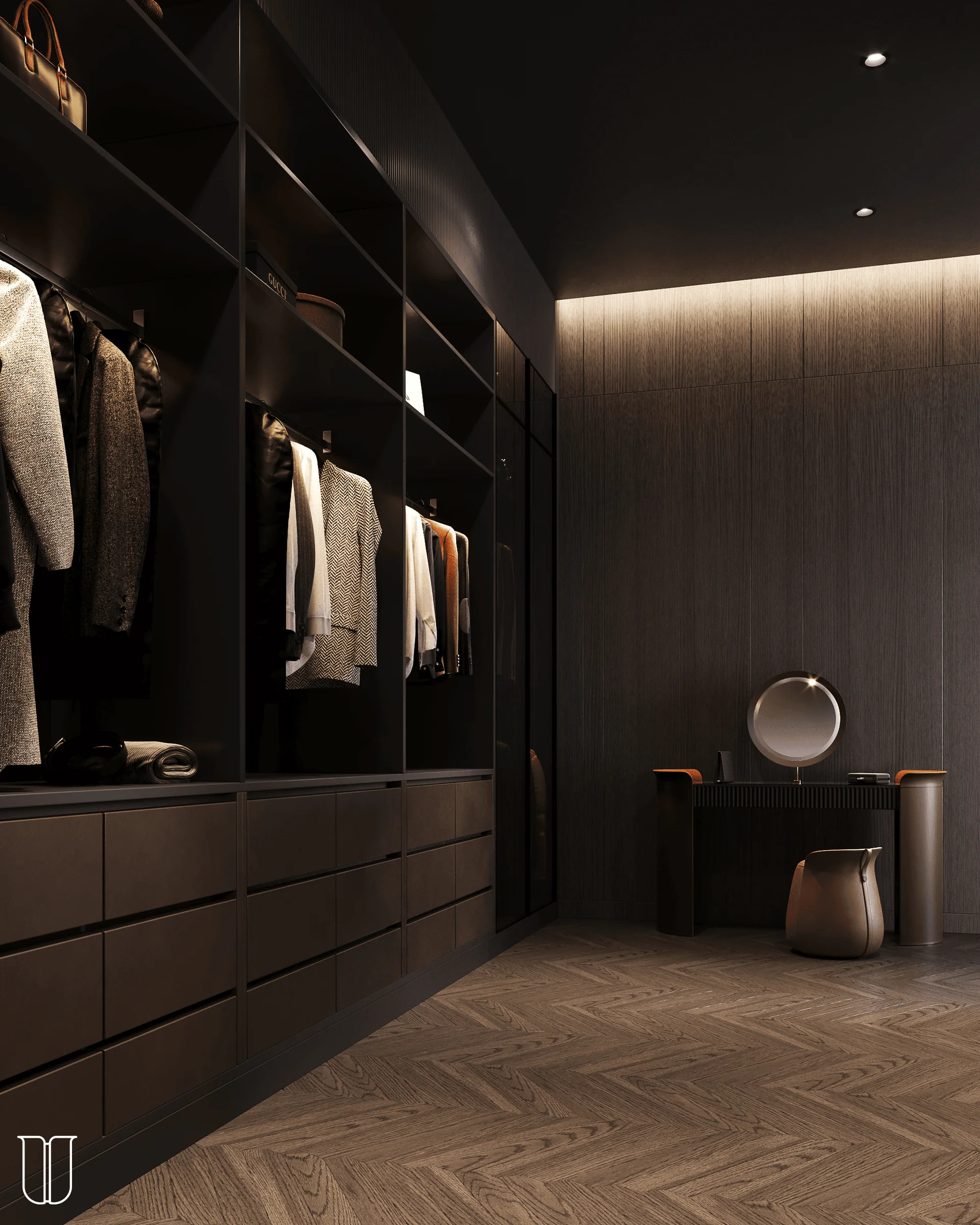In this area, you can organise the storage of jewelry, cosmetics, and accessories to quietly prepare for an evening out for dinner or relax after a meeting. The dressing table epitomises a woman's space and creates a sense of cosiness.
