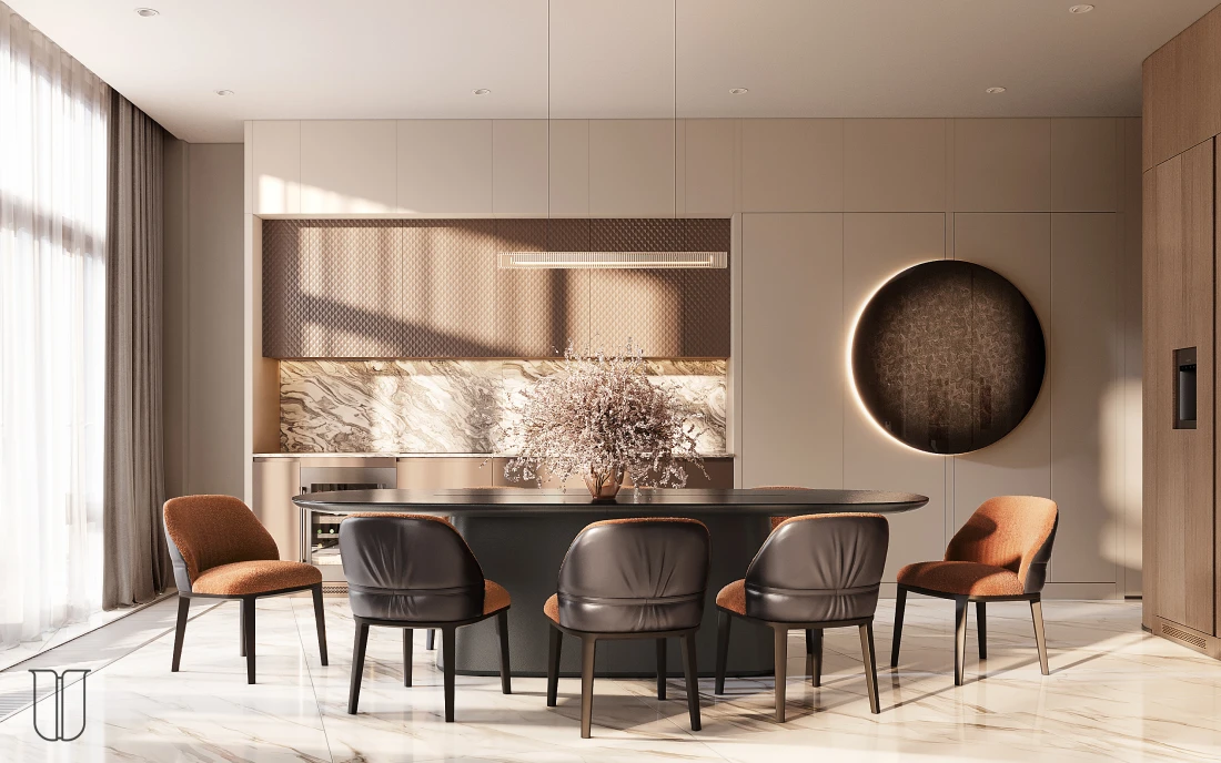 Столовая — пространство, где эстетика становится частью ежедневного ритуала. Итальянские столовые группы славятся каменными или шпонированными столешницами и идеально выверенными пропорциями оснований.