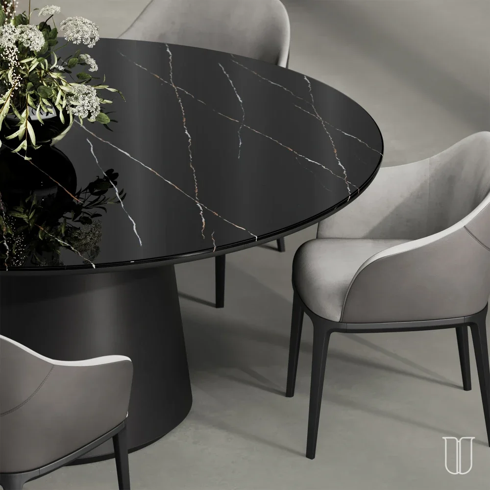 FiftyFourms embodies this principle by combining materials with different physical properties. For example, our Poise dining tables use quartz agglomerate, a composite material with a Mohs hardness rating of 7, which exceeds that of many natural stones, including marble. Its completely non-porous surface contrasts with the warm and soft natural leather of the legs. This creates a complex symbiosis that is one of the subtle but key markers of luxury.