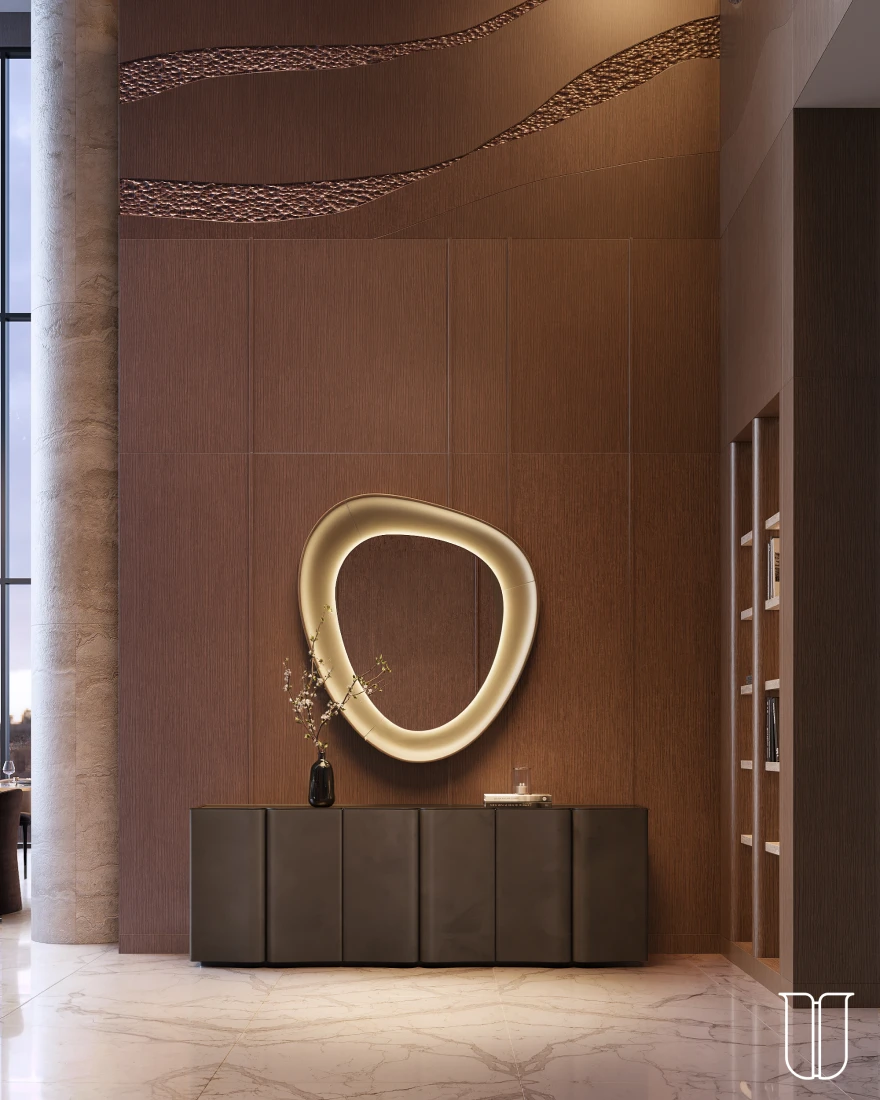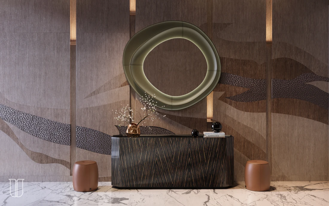 A mirror or lighting element forms the architectural backbone of the space. These pieces elongate the volume, enhance the perception of height, and create visual depth, setting the mood for the entire hall.