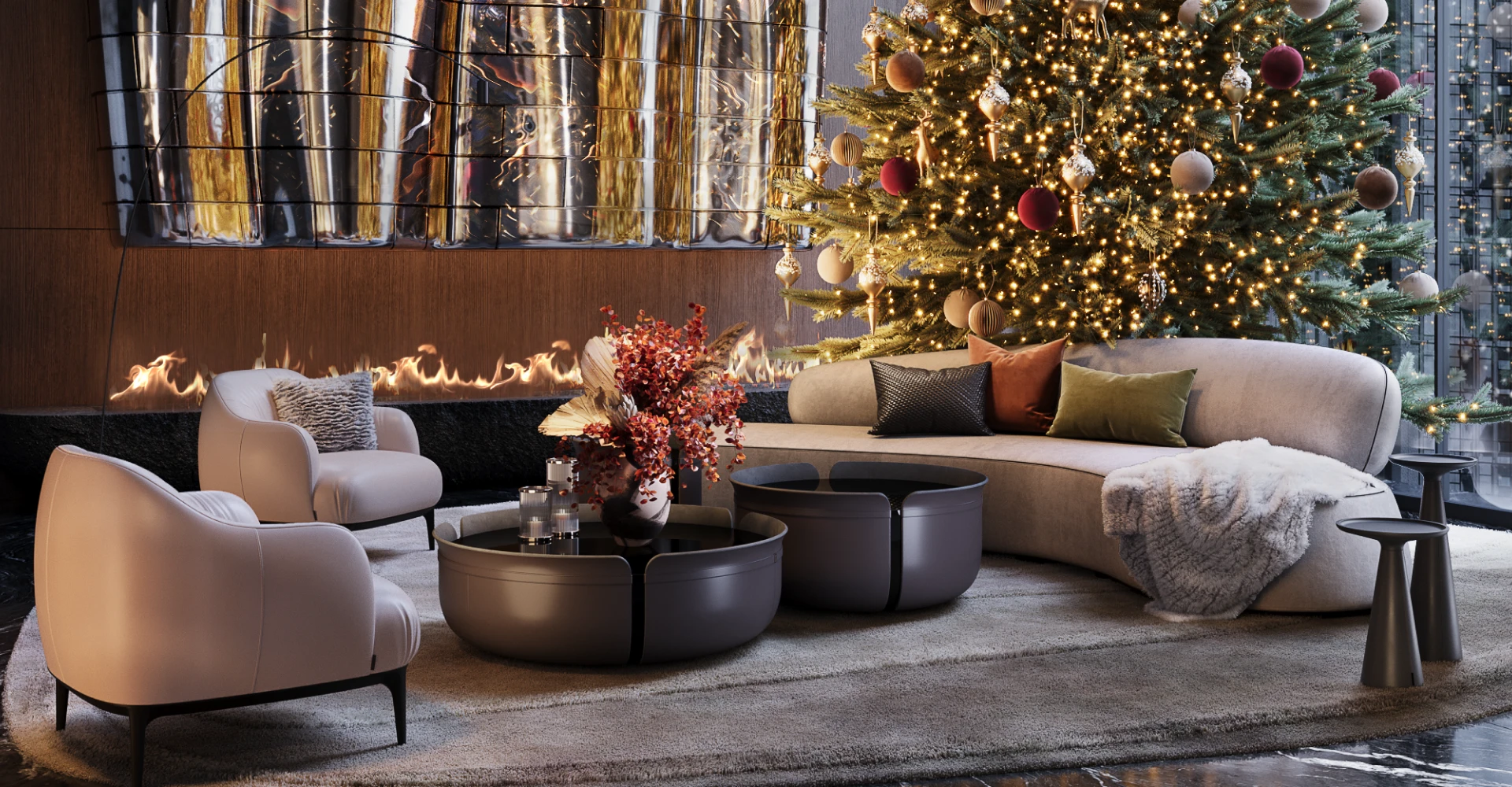 A thoughtful layout and carefully selected materials transform the lounge zone into the heart of the space — a universal, adaptable area ready for any festive scenario.